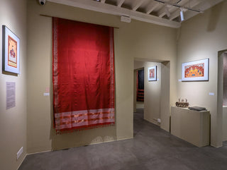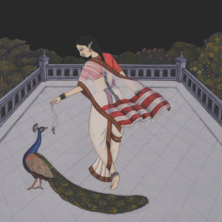 During the research, much was learnt through the Maratha miniature paintings of the time, a style that continued developing through the 17th and 18th centuries, all the while absorbing influences from the North as well as from the South. This show features some Maratha Style paintings that depict many of the sarees which have been brought to life by the team of artists atVinay's studio. Details cover the textiles, the jewellery and even the architecture.