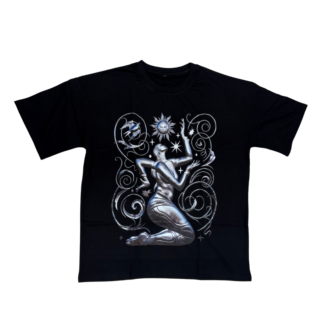 To some, the belief in the Dark Sun is the belief in hope. Symbolizing an eternal devotion to finding the Rahsmian Cluster, this t-shirt features a person extending their arms - pledging their fealty to their cause of finding the hidden corner of the cosmos powered by the Dark Sun.